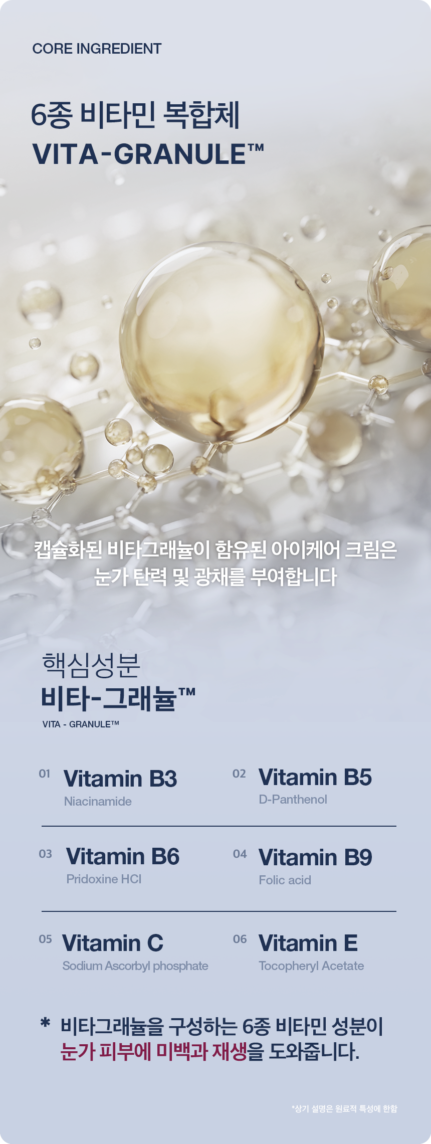 | 핵심성분 | Vitamin B3(Niacinamide), Vitamin B5(D-Panthenol), Vitamin B6(Pridoxine HCI), Vitamin B9(Folic acid) Vitamin C(Sodium Ascorbyl phosphate), Vitamin E(Tocopheryl Acetate) |
