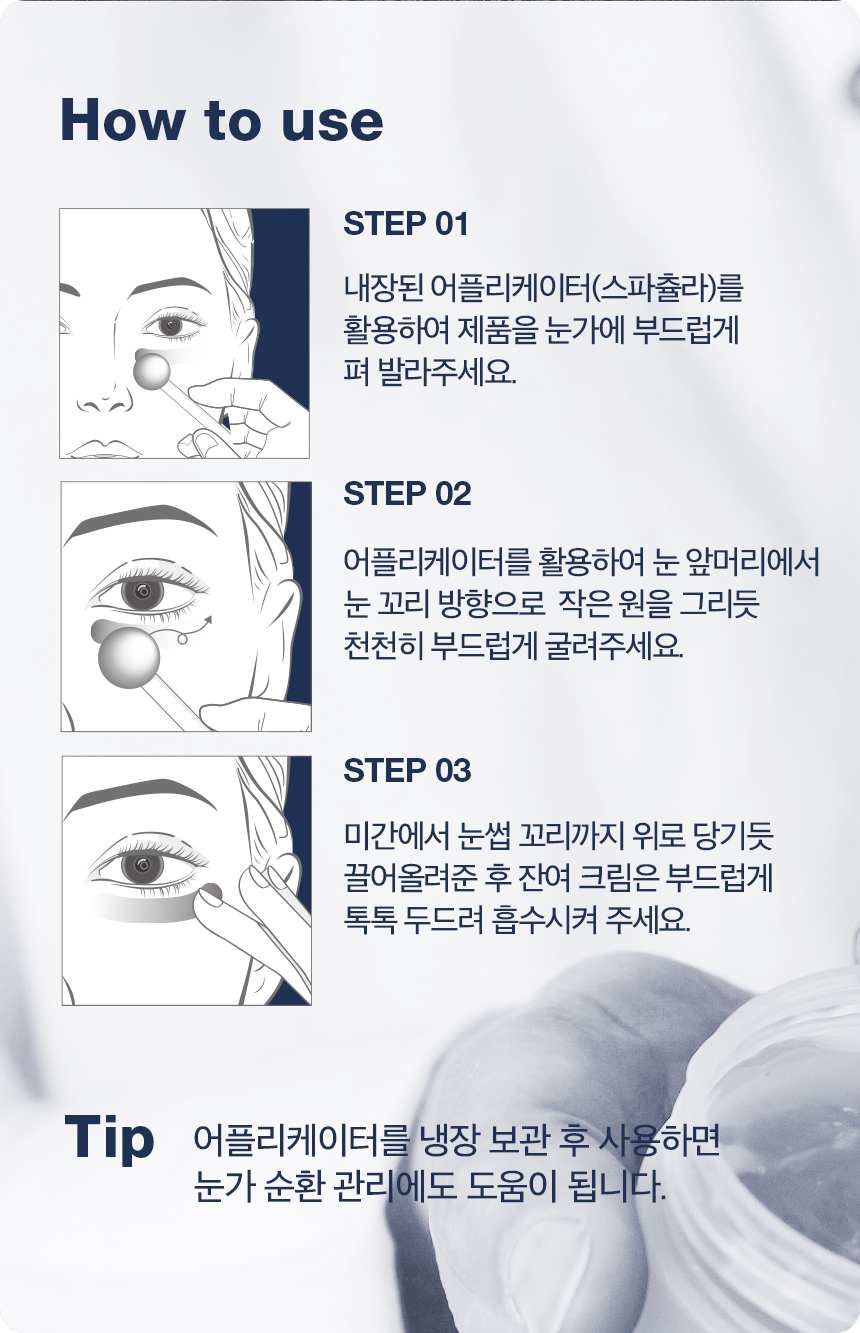 | 사용방법 | 01 내장된 어플리케이터(스파츌라)를 활용하여 제품을 눈밑부터 눈두덩이까지 눈 주변에 부드럽게 펴 발라주세요. 02 어플리케이터를 활용하여 눈 앞머리에서 눈 꼬리 방향으로 작은 원을 그리듯 천천히 부드럽게 굴려주세요. 03 미간에서 눈썹 꼬리까지 위로 당기듯 끌어올려준 후 잔여 크림은 부드럽게 톡톡 두들겨 흡수시켜주세요. |