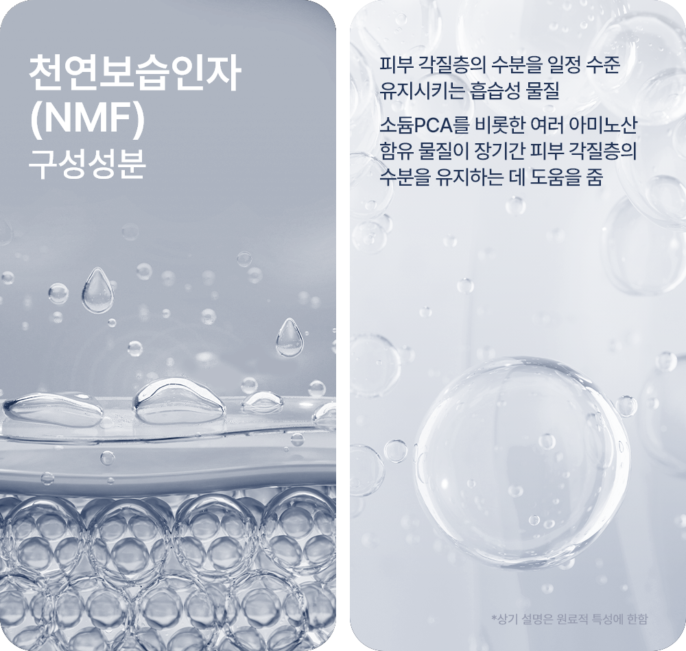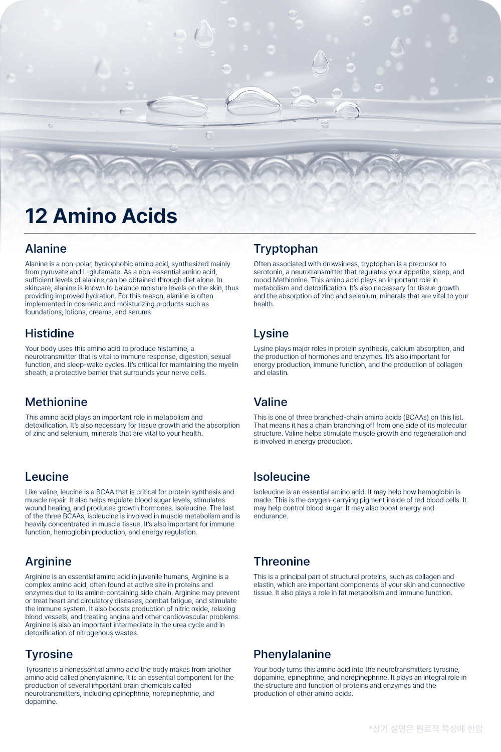 | 핵심성분 | Amino Acid 12 complex, Barrier complex, Polyglutamic Acid, Sodium PCA, Glyceryl Glucoside, Panthenol |