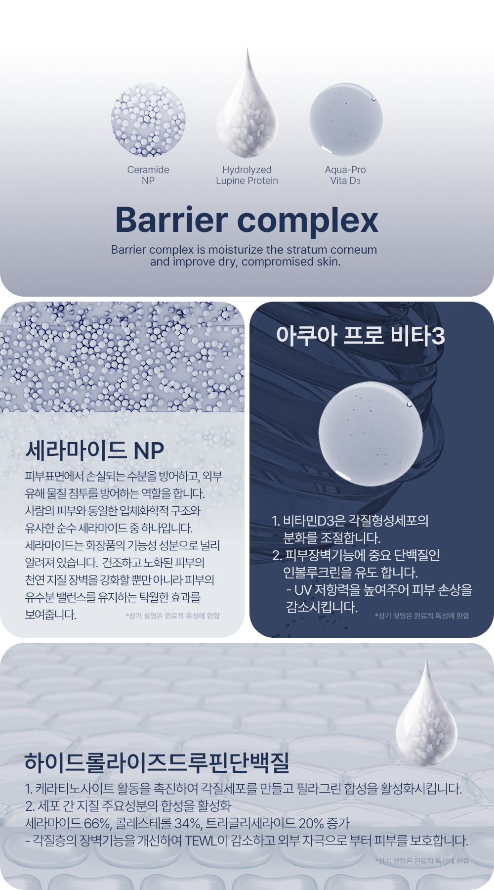 | 핵심성분 | Glyceryl Glucoside, Panthenol, Sodium Hyaluronate, Ceramide NP, Hydrolyzed Lupine Protein, Aqua-pro Vita D3 |