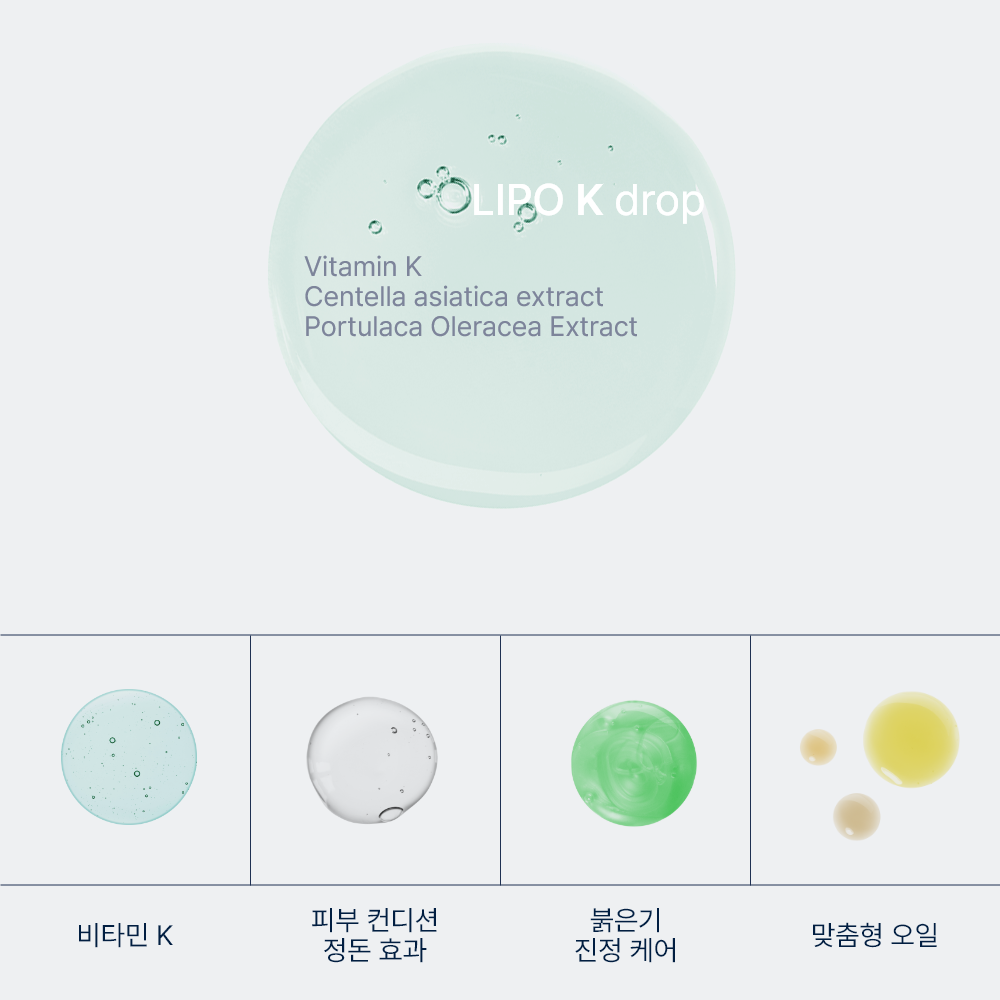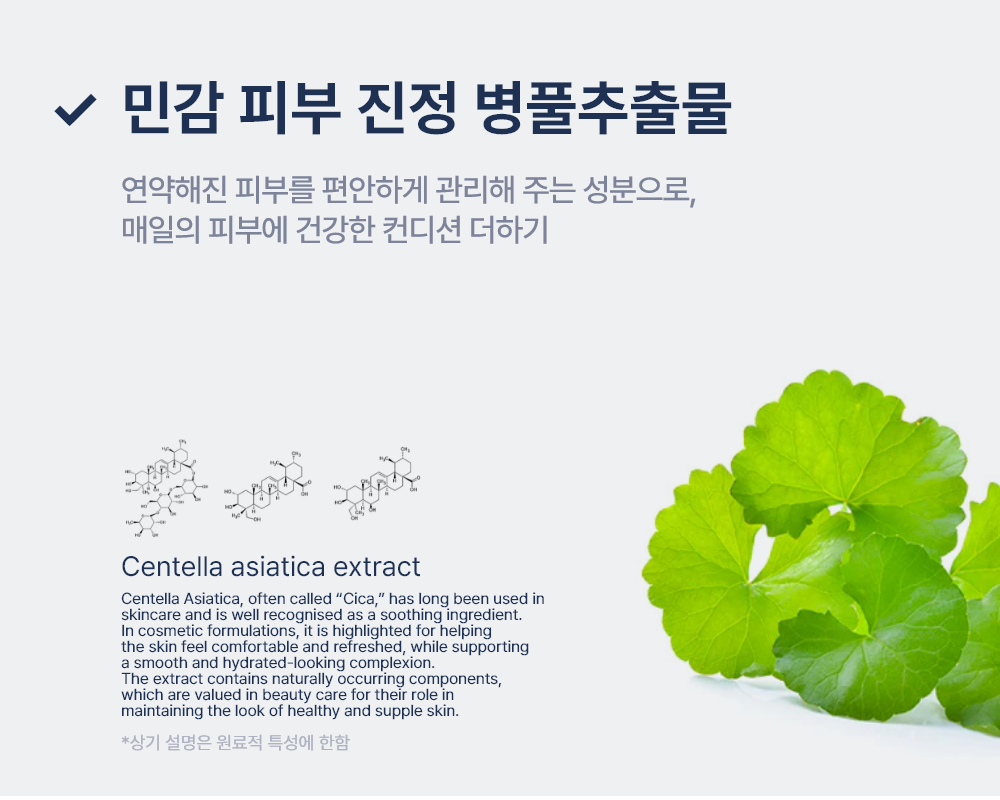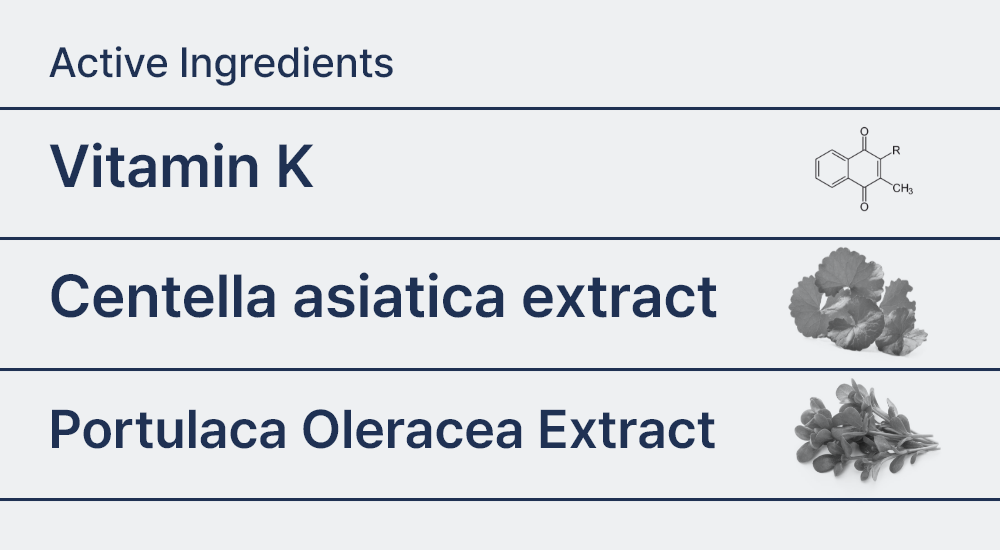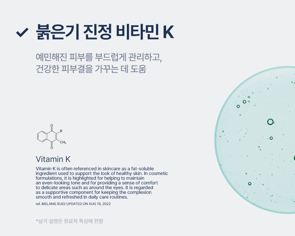 비타민K, 병풀추물, 마치현추출물의 함유로 모세혈관을 튼튼하게 하여 외부자극으로 인한 붉음증 완화, 피부 재생 및 진정 효과에 도움