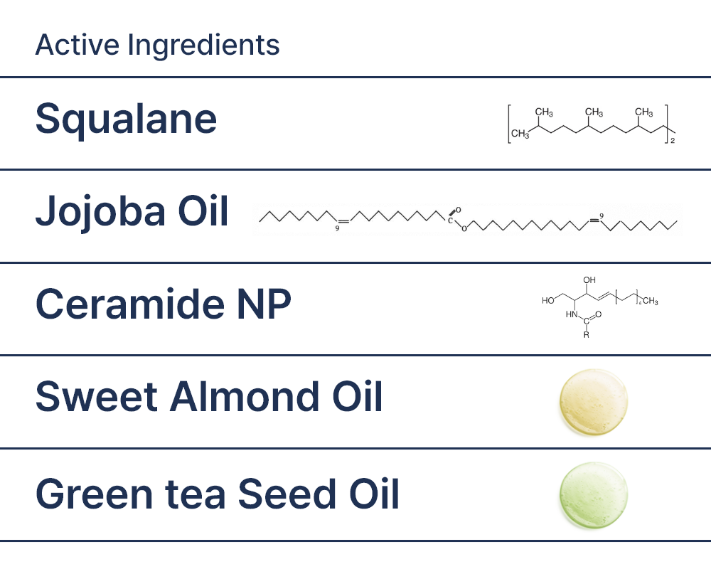 스위트아몬드오일, 호호바씨오일, 카프릴릭/카프릭트라이글리세라이드, 스쿠알란, 해바라기씨오일, 녹차씨오일, 세라마이드엔피, 글리세릴글루코사이드, 글리세린, 토코페릴아세테이트