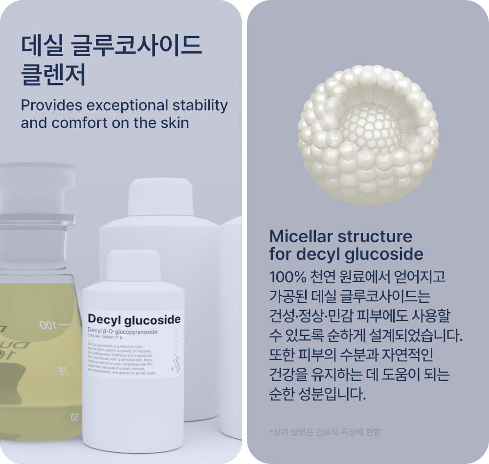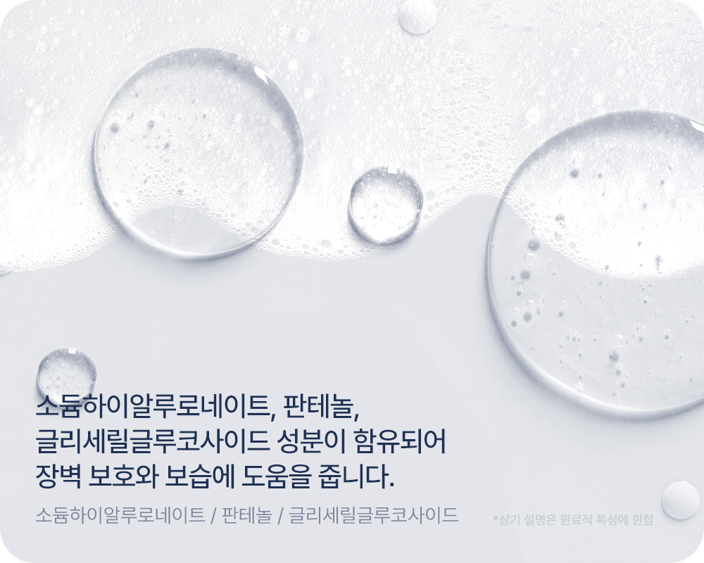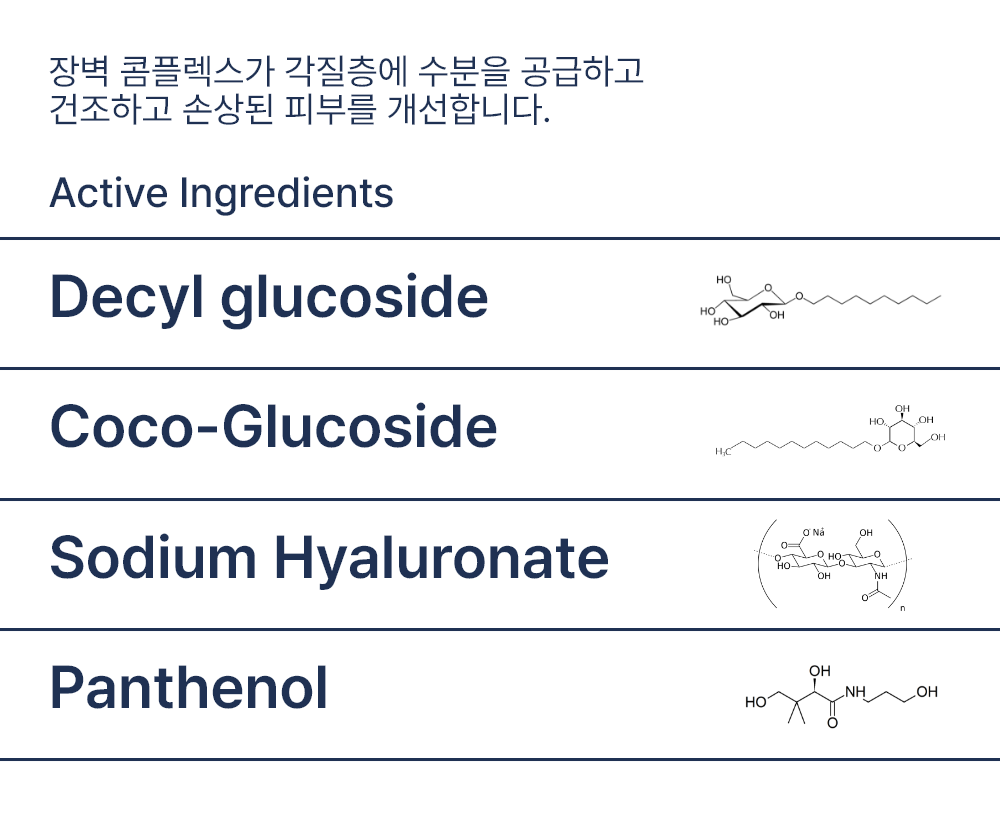 | 핵심성분 | Barrier complex, Decyl Glucoside, Coco-Glucoside, Sodium Hyaluronate, Panthenol, Glyceryl glucoside, Centella asiatica extract, Portulaca Oleracea Extract |
